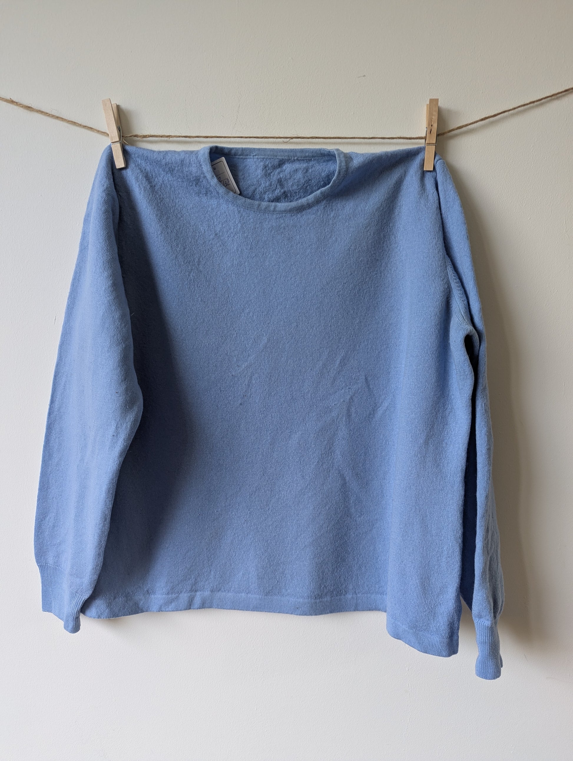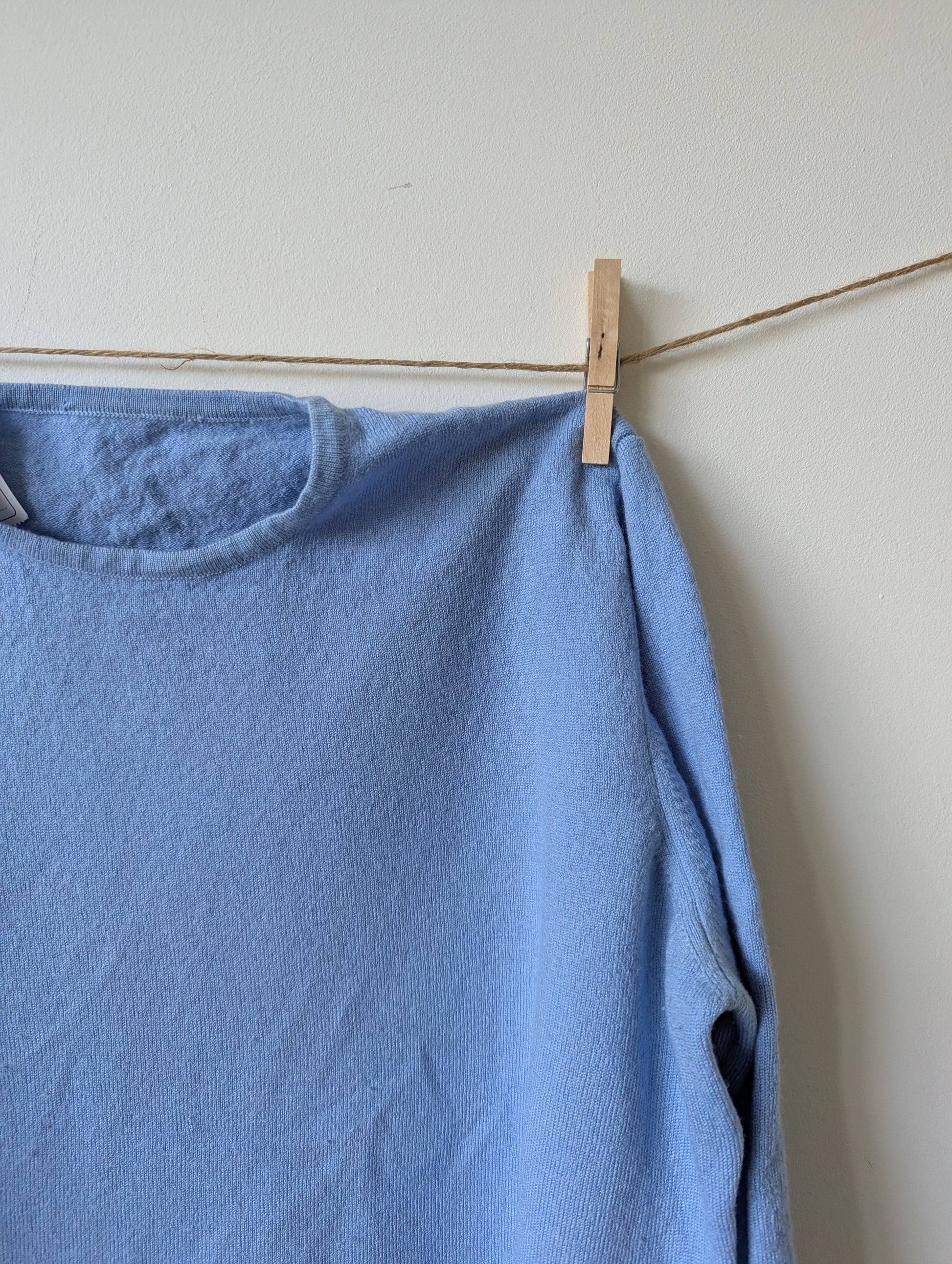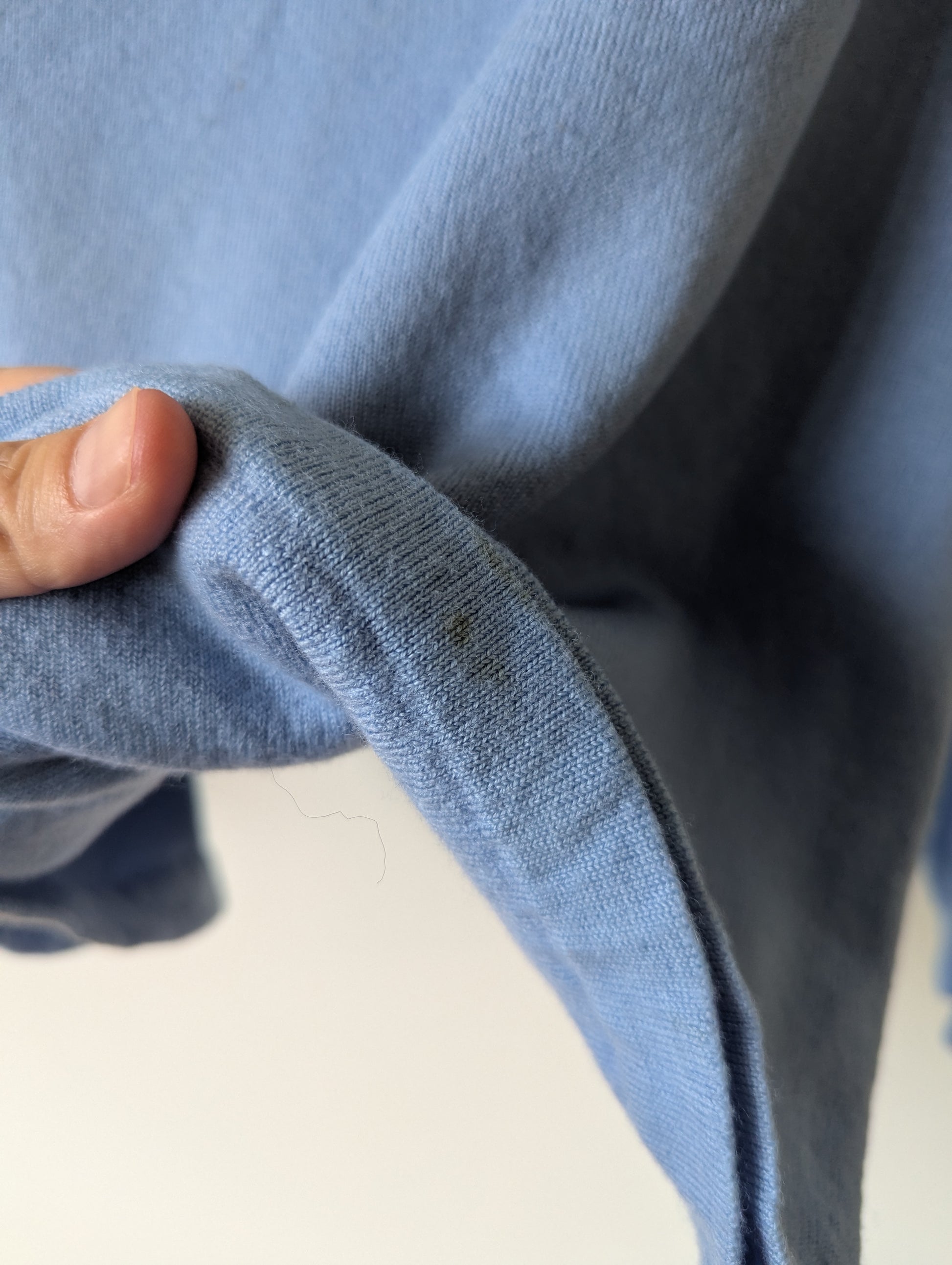 Mooi zacht lichtblauw truitje met ronde hals. Klein vlekje aan de onderkant zie foto.